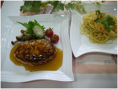 日本の食材「豆腐ハンバーグ」にチーズを入れてタレにしょうがをきかせました。大根おろしといっしょに食べると美味しいです。隠し味も工夫してます。日本で優勝させてもらって、結局シンガポールのチャンピオンの方と対決になりました。