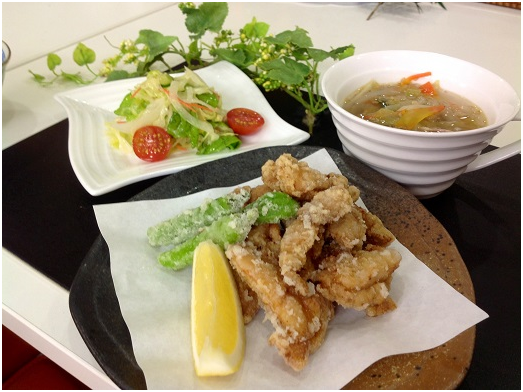 3月の家庭料理:鶏のから揚げ・野菜スープに佐藤君特製のサラダも付いて、美味しさがお教室にあふれています。最近では試食の前にお持ち帰り用に別に入れて、明日のお弁当に家族のお土産に用意される人も多いです。お持ち帰りまで考えて作るのが、すっかりこのお教室の特徴になっています。から揚げも簡単なようで、さくさくに揚げるのは難しいです。