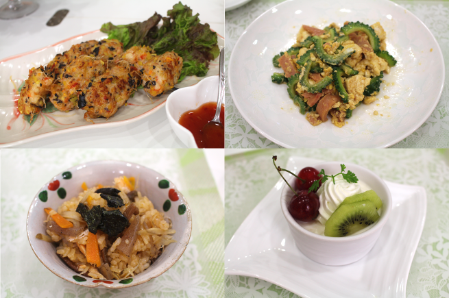 | 皮なし揚げ春巻き ゴーヤチャンプル サーモンのコリアンピラフ ※感染予防対策のためレッスンはショートコースのみとなります。上記写真のデザートは実習に含まれませんので予めご了承下さい。 |