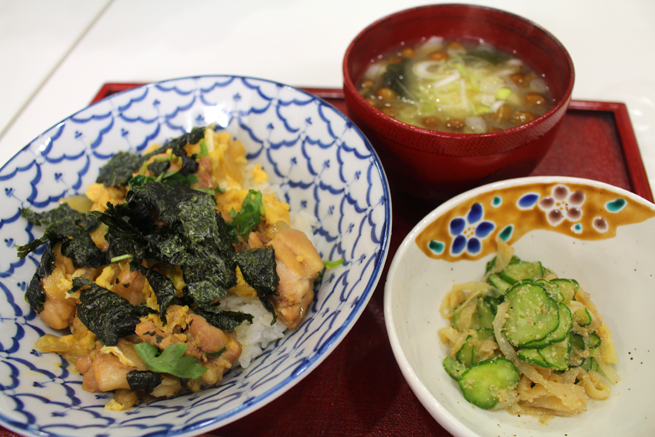 | 親子丼 きゅうりとクラゲのごま酢和え 豆腐となめこの味噌汁 |