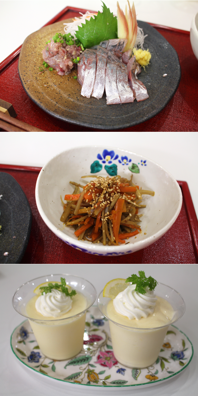 | アジのたたき ごぼうと人参のきんぴら レモンムース |