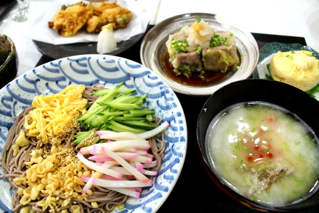 | ワイン 冷やし吸い物 新キャベツの重ね蒸し 卵寄せ 夏のかき揚げ 冷やしたぬき蕎麦 |