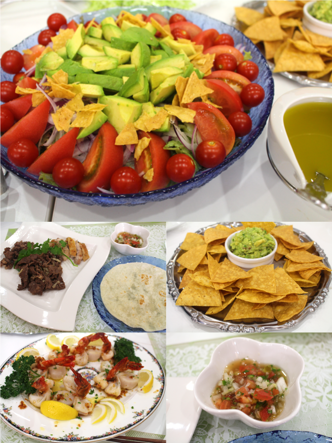 | ワカモーレ・チャーロ・メグロ タコス(ビーフ・チキン) 海老とホタテのにんにく炒め メキシカンサラダ |