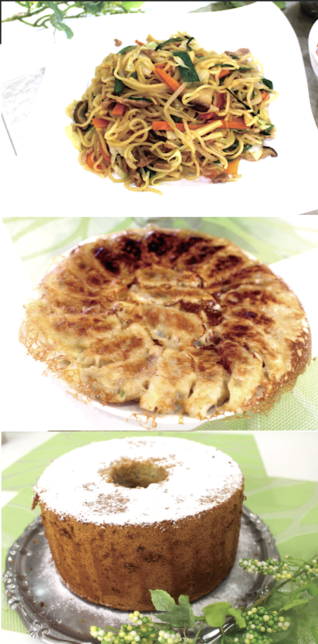 | 上海風焼きそば 羽根つき焼き餃子 バナナシフォンケーキ |
