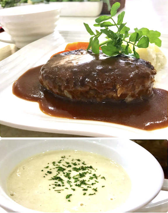 | ハンバーグデミグラスソース にんじんのグラッセ 粉ふきいも コーンポタージュスープ |