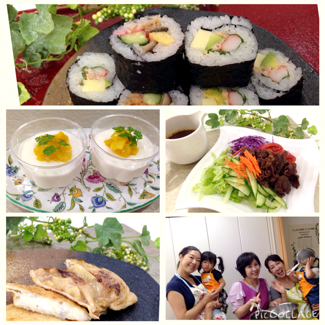 | ミートサラダ チーズインきんちゃく 簡単太巻き寿司 ※感染予防対策のためレッスンはショートコースのみとなります。上記写真のデザートは実習に含まれませんので予めご了承下さい。 |