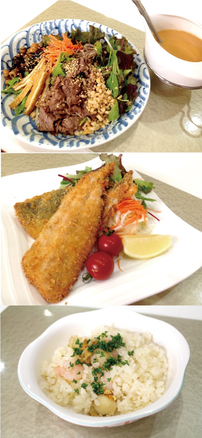 | シーフードピラフ そばサラダ(シンガポール大会優勝レシピ) なすの味噌炒め |