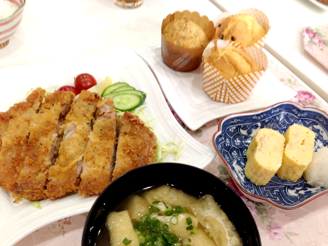 | 上とんかつゴマソース 厚焼き卵(一人1本) 玉ねぎとキャベツの味噌汁 マフィン |
