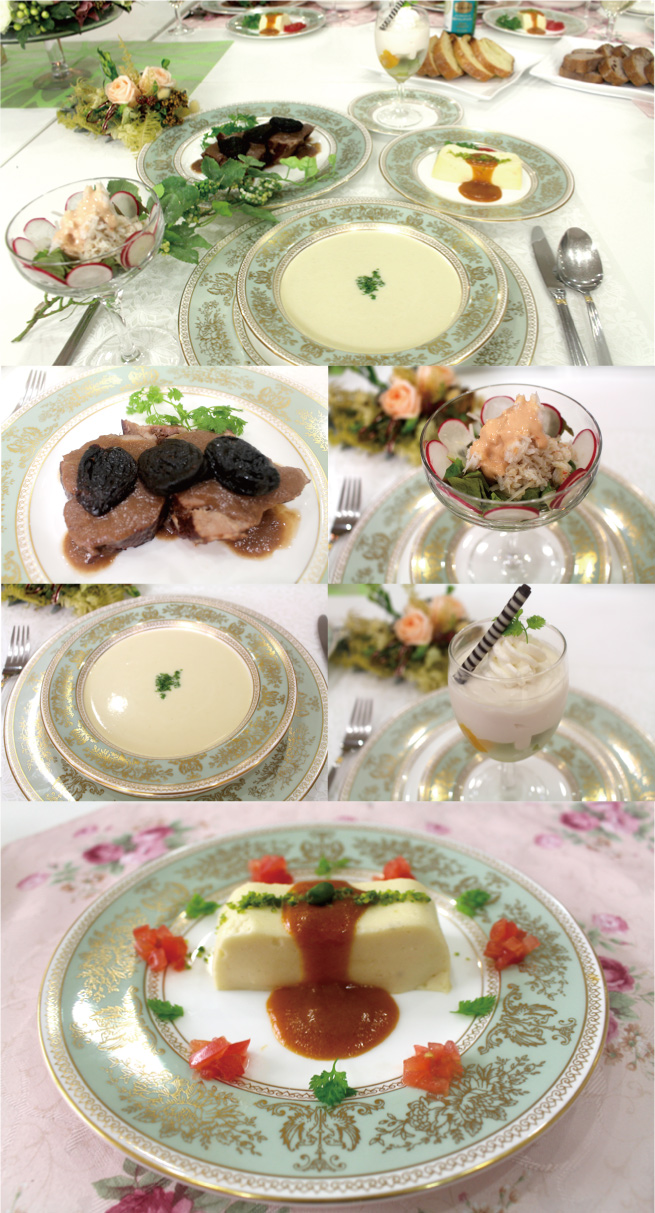 | 豚肉のプラムソース かにのカクテル そら豆のポタージュ 白身魚のムース ※感染予防対策のためレッスンはショートコースのみとなります。上記写真のデザートは実習に含まれませんので予めご了承下さい。 |