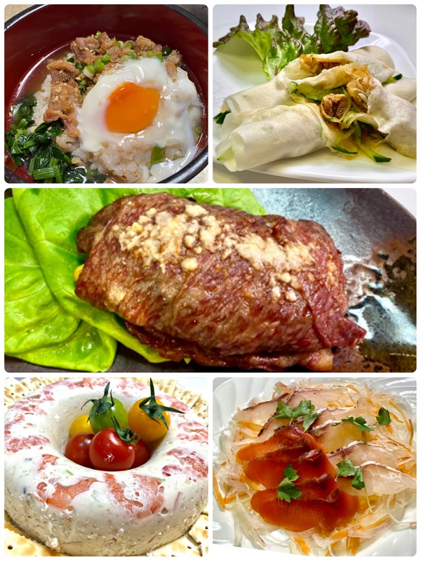 | マッシュポテトの牛肉包み焼き シュリンプモルド 比内地鶏の北京ダック風 ひつまぶし 鯛のカルパッチョ |