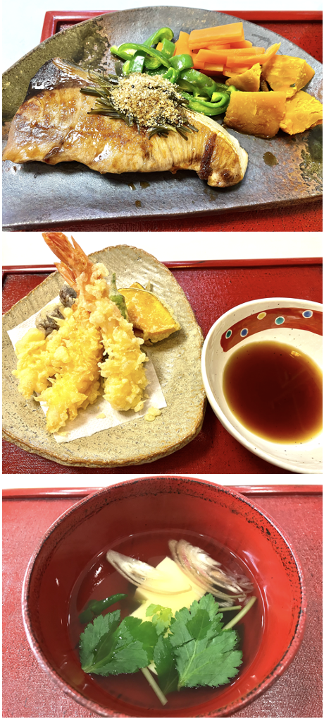 | 魚の照り焼き 温野菜添え 海老と野菜の天ぷら 卵豆腐の吸い物 |
